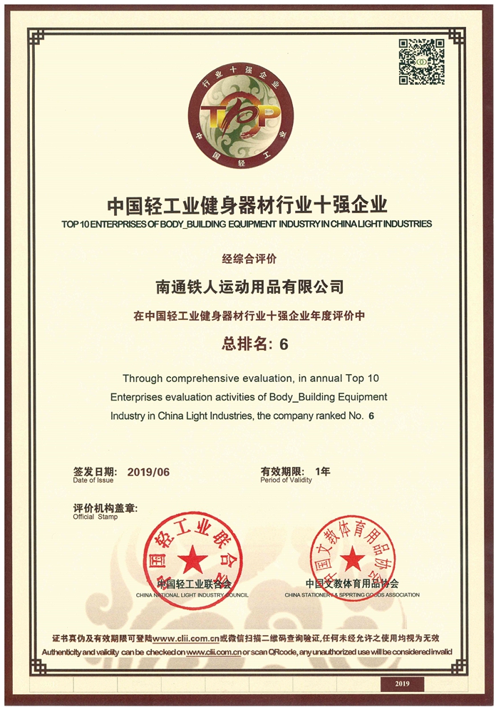 2019 2019中國輕工業健身器材行業十強企業 中國輕工業聯合會、中國文教體育用品協會 查看