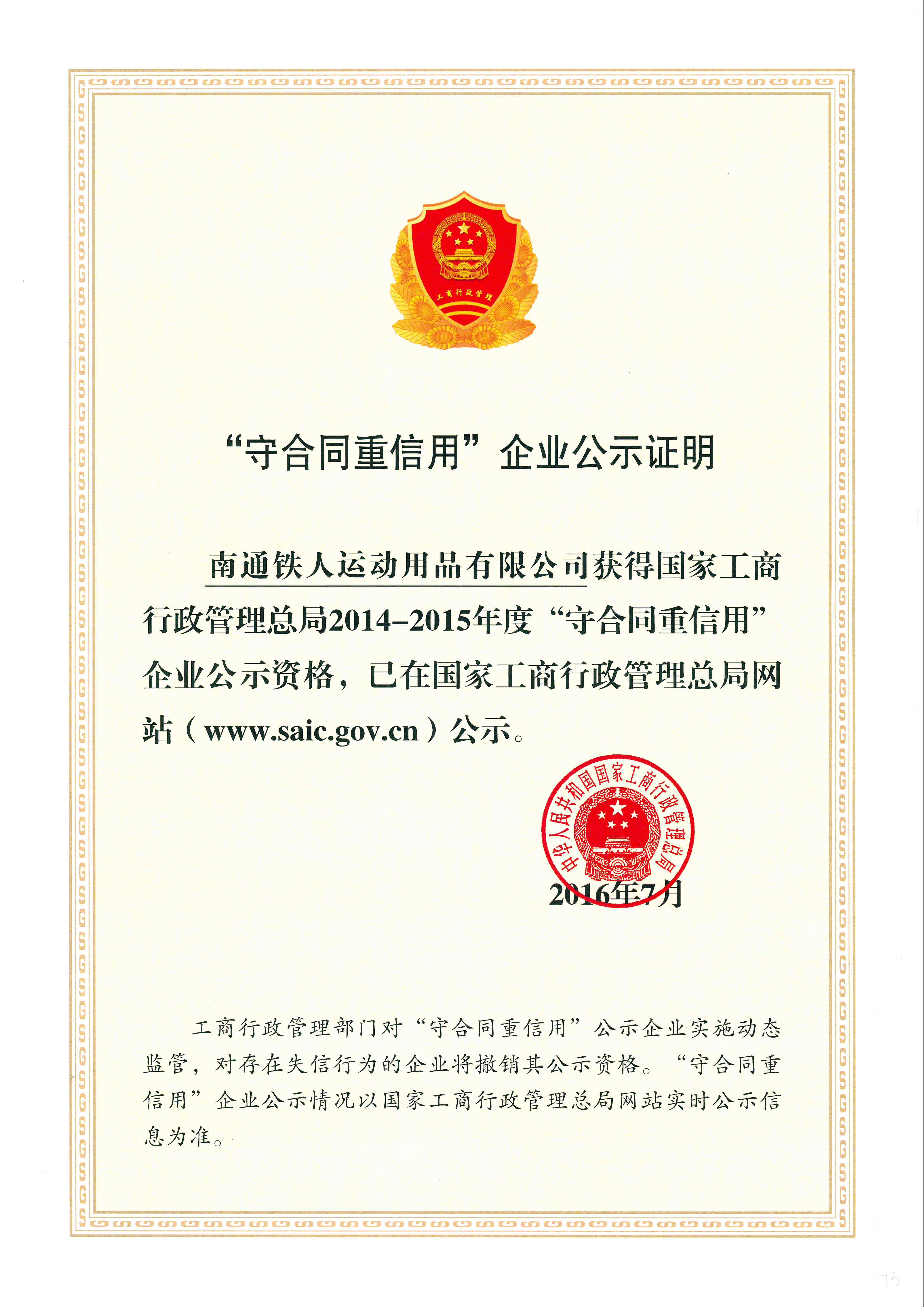 2015 全國“守合同重信用”企業 國家工商行政管理總局 查看